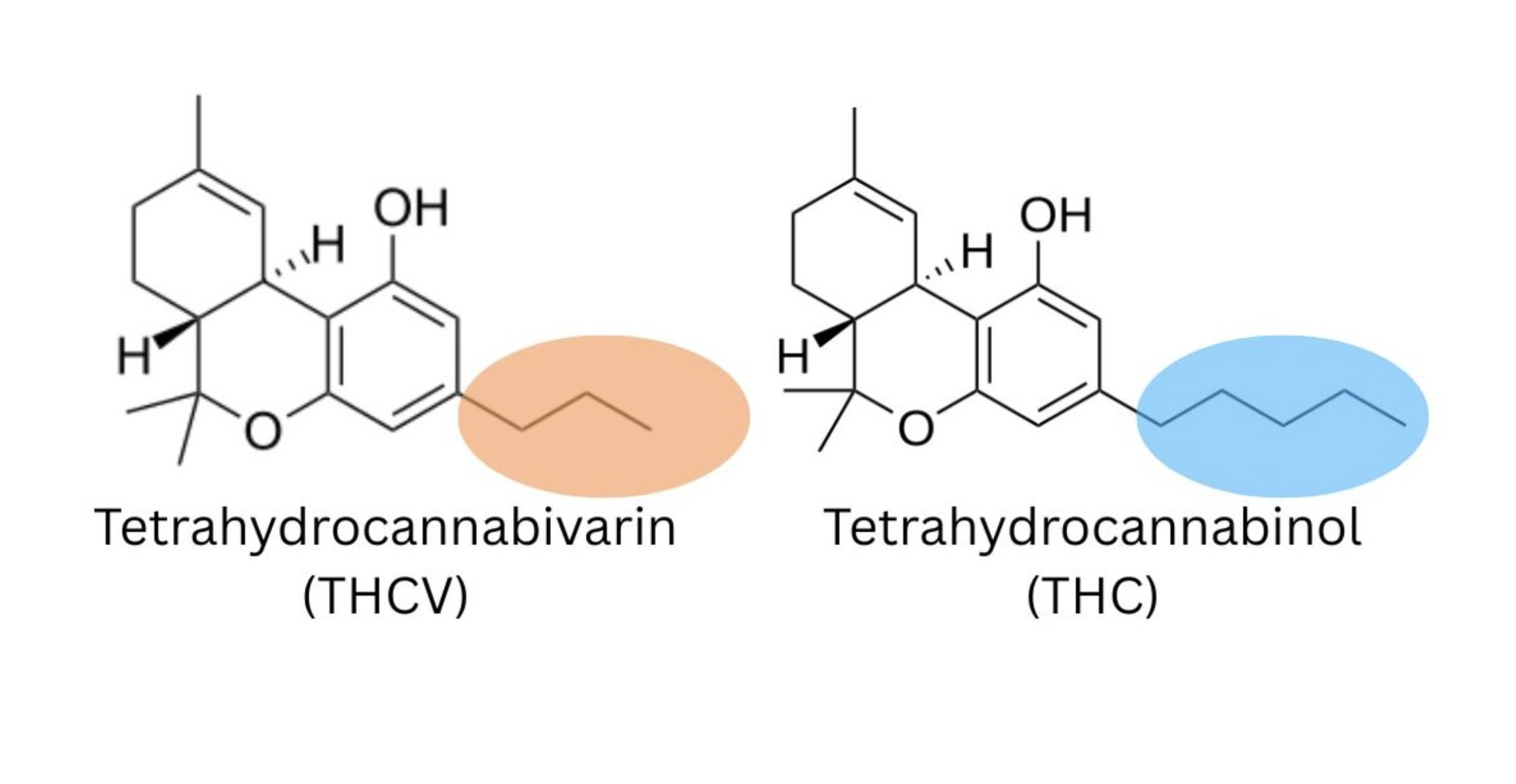 Last time, we mentioned an isomer of Delta-9-THC (THC), Delta-8-THC (D8). Isomer means these compounds share a chemical formula, made up of the exact same molecules but in different arrangements. For example, with D9 and D8 THC the placement of a double bond within the chemical structure on the eighth carbon instead of the ninth is the structural difference. The naming of different THC isomers is based on the placement of this carbon bond, such as in Delta-6-THC (sixth carbon), Delta-8-THC (eighth carbon), or Delta-10-THC (tenth carbon). This change to the molecule typically happens as a result of a chemical process, taking place within the plant or outside of the plant. The classification of ‘isomer’ does not apply to the relationship between THC and THCV as the chemical formulas of these two compounds are slightly different. The chemical difference between these compounds is found in the carbon tail of THCV (highlighted in orange). It is two carbons shorter than the carbon tail of THC (highlighted in blue) (Haghdoost, et al., 2025).